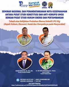 Pusat Studi Konstitusi dan Anti Korupsi (PUSKASI) Universitas Muhammadyah Sumatera Utara (UMSU) dan Pusat Studi Hukum Energi dan Pertambangan (PUSHEP) menyelenggarakan SEMINAR NASIONAL DAN PENANDATANGANAN NOTA KESEPAHAMAN ANTARA PUSKASI Universitas Muhammadyah Sumatera Utara ( UMSU ) sebagai kampus terbaik di kota Medan DENGAN PUSHEP pada hari Jum’at, 05 November 2021 pukul 13.30 WIB s.d. selesai.