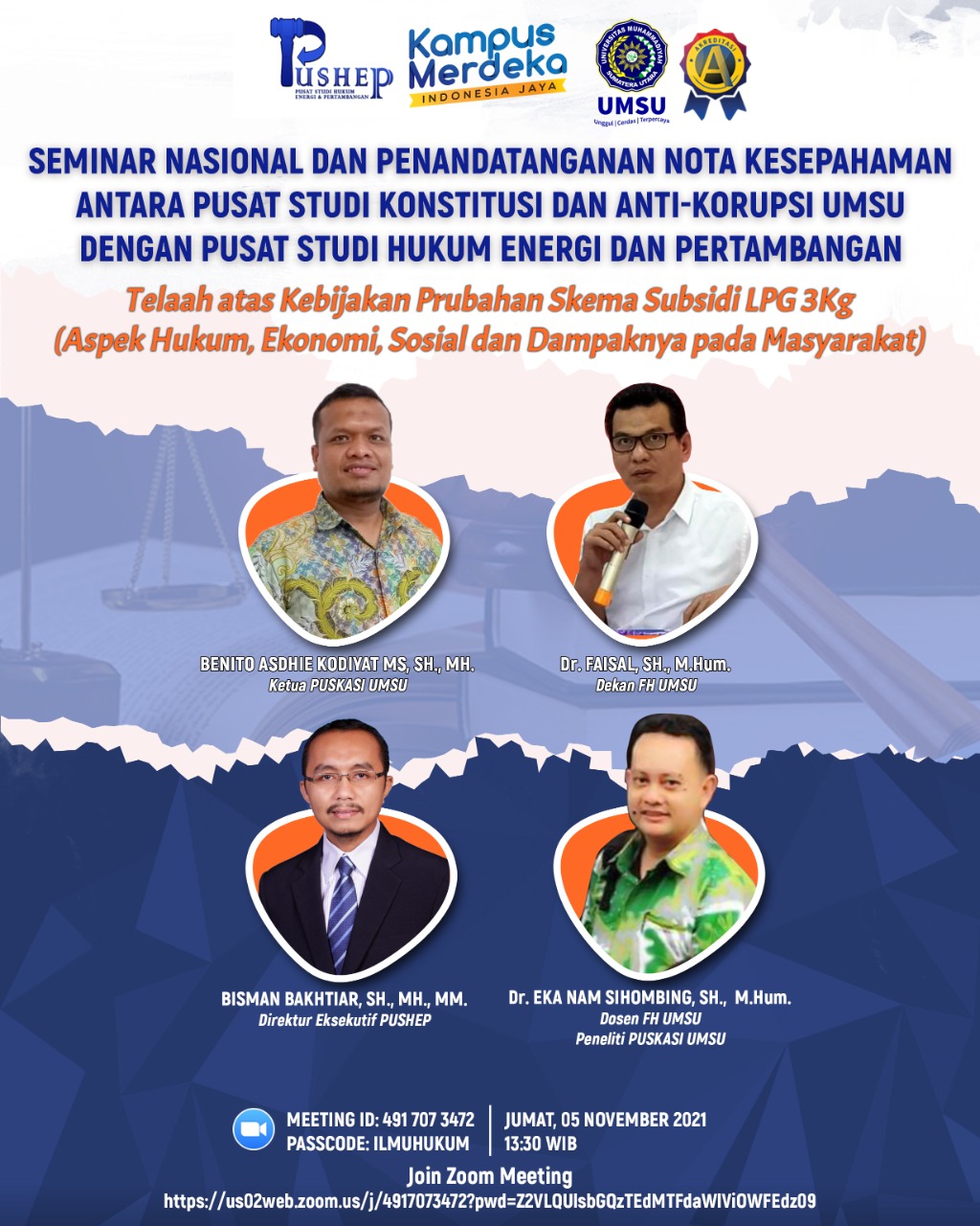 Seminar ini dilaksanakan melalui online menggunakan Zoom dengan Meeting ID: 491 707 3472 dan Passcode: ILMUHUKUM
