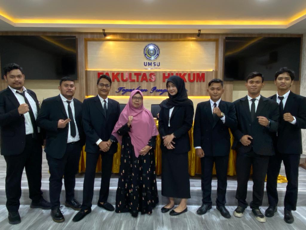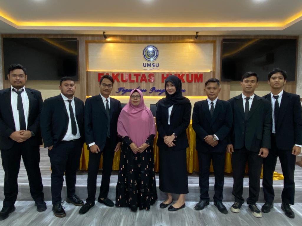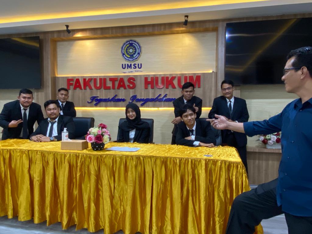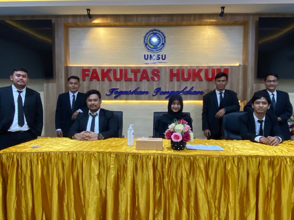 Dekan Fakultas Hukum UMSU Dr. Faisal, SH., M.Hum diwakili oleh Wakil Dekan-III Atikah Rahmi, SH., MH pada hari ini Rabu, 25/5/2022 membuka langsung Sidang Meja Hijau Fakultas Hukum UMSU dan membacakan undangan Sidang nomor: 624/II.3-AU/UMSU-06/F/2022 di ruang sidang gedung C Lt. I dengan jumlah peserta 7 mahasiswa sebagai peserta Sidang Meja Hijau yakni: 1. ARIWIBOWO GINTING (1606200320), 2. YUSRI SYUKRON TANSYAH SIAGIAN (1606200208), 3. ARIF MULIA HARAHAP (1706200345), 4. ANANDA GHANIA RAHMAN (1706200185), 5. FARRAS SYAFIQ NASUTION (1606200216), 6. ABDUL MALIK SITOMPUL (1506200217), dan 7. MUHAMMAD FIDEL HAWARI (1606200032). pada kesempatan ini photo bersama dengan pimpinan Fakultas Hukum UMSU dilaksanakan di Ruang Sidang Fakultas Hukum UMSU Medan 25/5/2022.