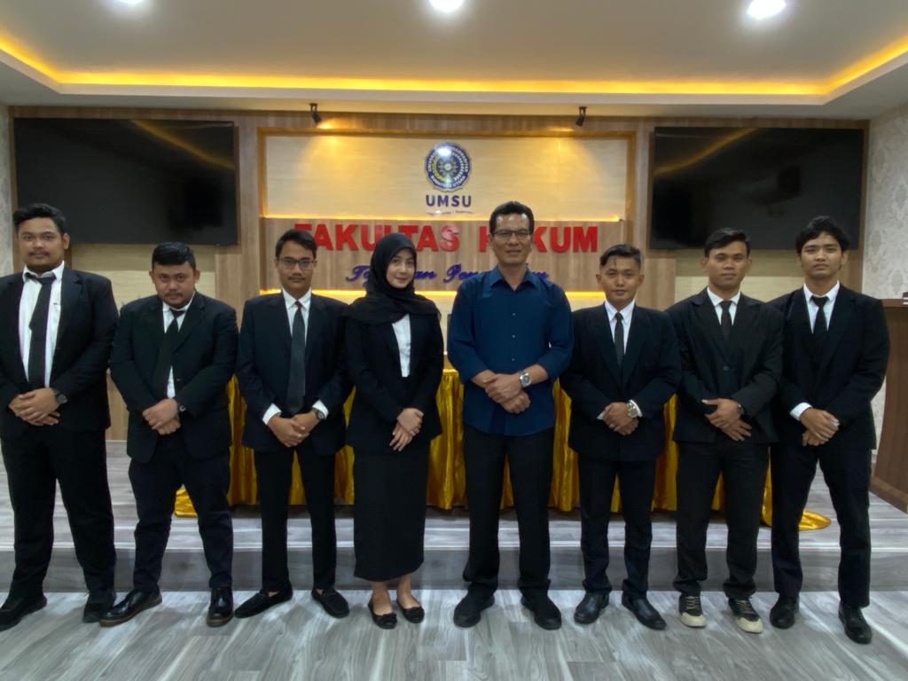 Dekan Fakultas Hukum UMSU Dr. Faisal, SH., M.Hum diwakili oleh Wakil Dekan-III Atikah Rahmi, SH., MH pada hari ini Rabu, 25/5/2022 membuka langsung Sidang Meja Hijau Fakultas Hukum UMSU dan membacakan undangan Sidang nomor: 624/II.3-AU/UMSU-06/F/2022 di ruang sidang gedung C Lt. I dengan jumlah peserta 7 mahasiswa sebagai peserta Sidang Meja Hijau yakni: 1. ARIWIBOWO GINTING (1606200320), 2. YUSRI SYUKRON TANSYAH SIAGIAN (1606200208), 3. ARIF MULIA HARAHAP (1706200345), 4. ANANDA GHANIA RAHMAN (1706200185), 5. FARRAS SYAFIQ NASUTION (1606200216), 6. ABDUL MALIK SITOMPUL (1506200217), dan 7. MUHAMMAD FIDEL HAWARI (1606200032). pada kesempatan ini photo bersama dengan pimpinan Fakultas Hukum UMSU dilaksanakan di Ruang Sidang Fakultas Hukum UMSU Medan 25/5/2022.