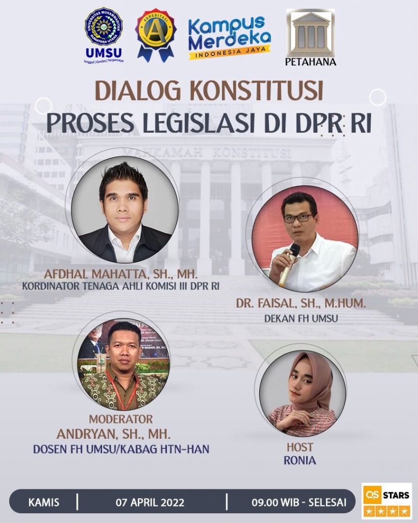 Fakultas hukum Universitas Muhamadiyah Sumatera Utara kembali menggelar kegiatan Webinar yang mengangkat tema proses legislasi di DPR, Kamis/7/4/2022. Adapun Narasumber yang hadir dalam kegiatan webinar yakni koordinator tenaga ahli Komisi III DPR RI, Afdhal Mahatta, S.H., M.H dan dipandu oleh moderator sekaligus sebagai Kepala Bagian HTN/HAN, Andryan, S.H, M.H. serta MC, Ronia. Dekan Fakultas Hukum Universitas Muhamadiyah Sumatera Utara, Dr. Faisal, S.H., M.Hum, didampingi Wakil Dekan I D. Zainuddin, S.H., M.H dan Wakil Dekan III Atikah Rahmi, S.H., M.H dalam sambutannya mengatakan bahwa Fakultas Hukum UMSU tidak berhenti untuk melaksanakan rangkaian kegiatan yang menunjang akademik. “Meskipun bulan ramadhan serta dalam liburan akademik di kampus, tetapi fakultas hukum tetap bersemangat untuk melaksanakan diskusi publik yang bernuansa akademik”.