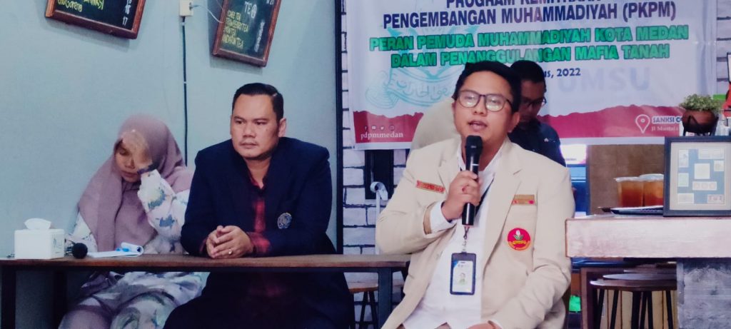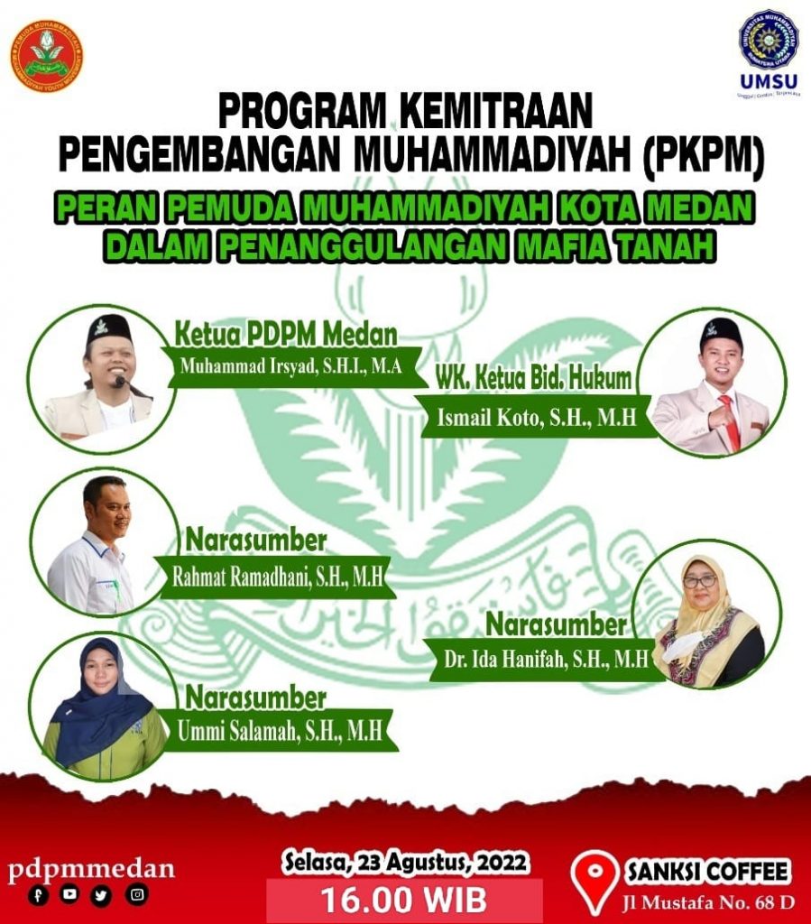 Program Kemitraan Pengembangan Muhammadiyah yang mengangkat tema Peran Pemuda Muhammadiyah Kota Medan Dalam Penanggulangan Mafia Tanah. Adapun yang menjadi Narasumber dalam kegiatan tersebut ialah Rahmat Ramadhani, S.H., M.H, Ismail Koto, S.H., M.H dan Ummi Salamah, S.H., M.Kn yang merupakan Dosen Fakultas Hukum UMSU.