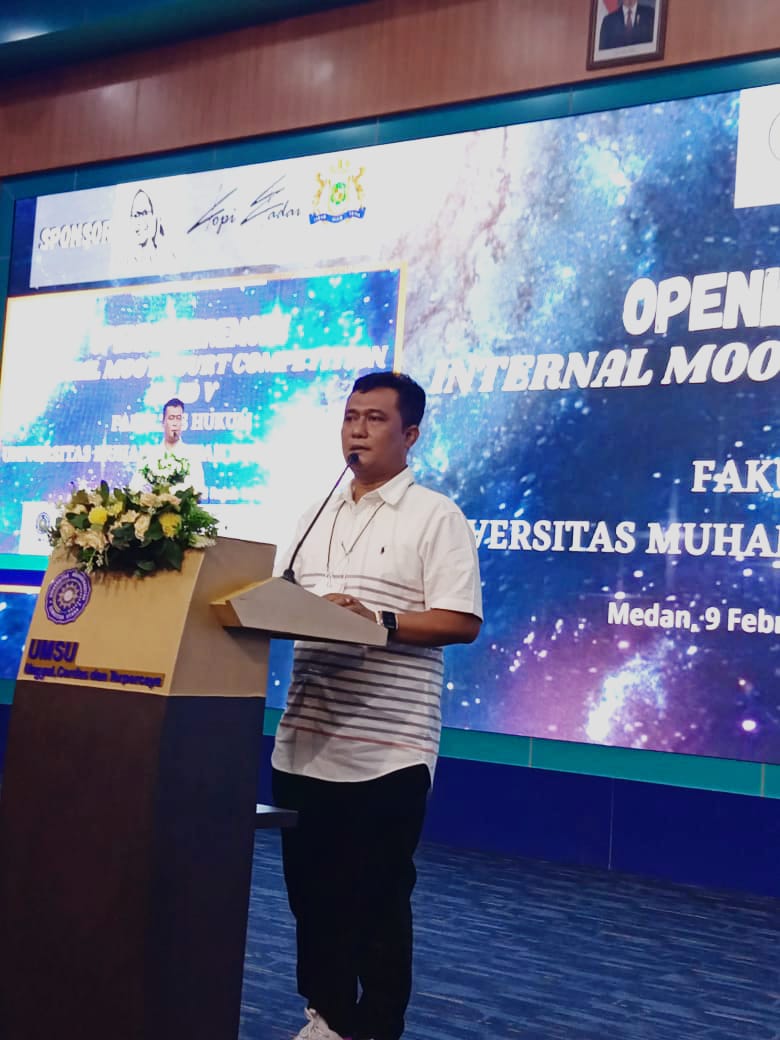 Kegiatan pembukaan Internal Moot Court Competition dihadiri Wakil Rektor-I UMSU (Prof. Dr. H. Mhd. Arifin, SH., M.Hum), Gubernur Sumatera Utara diwakili oleh Bapak Budi Syahputra, S.Pd., M.Si (Kabid. pelayanan dispora Sumatera Utara), Bapak Pangdam diwakili oleh Kolonel Eryc Crisyanto Simanjuntak, SH., M.H dan Pengadilan Negeri Medan Bapak Dr. Yoes Soemaryono., M.H., MSC (Hakim PN) dan Bapak /Ibu Dosen Dilingkungan Fakultas Hukum UMSU serta Para Peserta Internal Moot Court Competition Jilid V, Alumni IMCC Fakultas Hukum UMSU.
