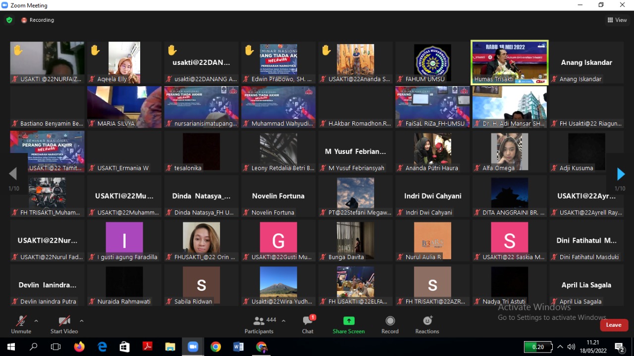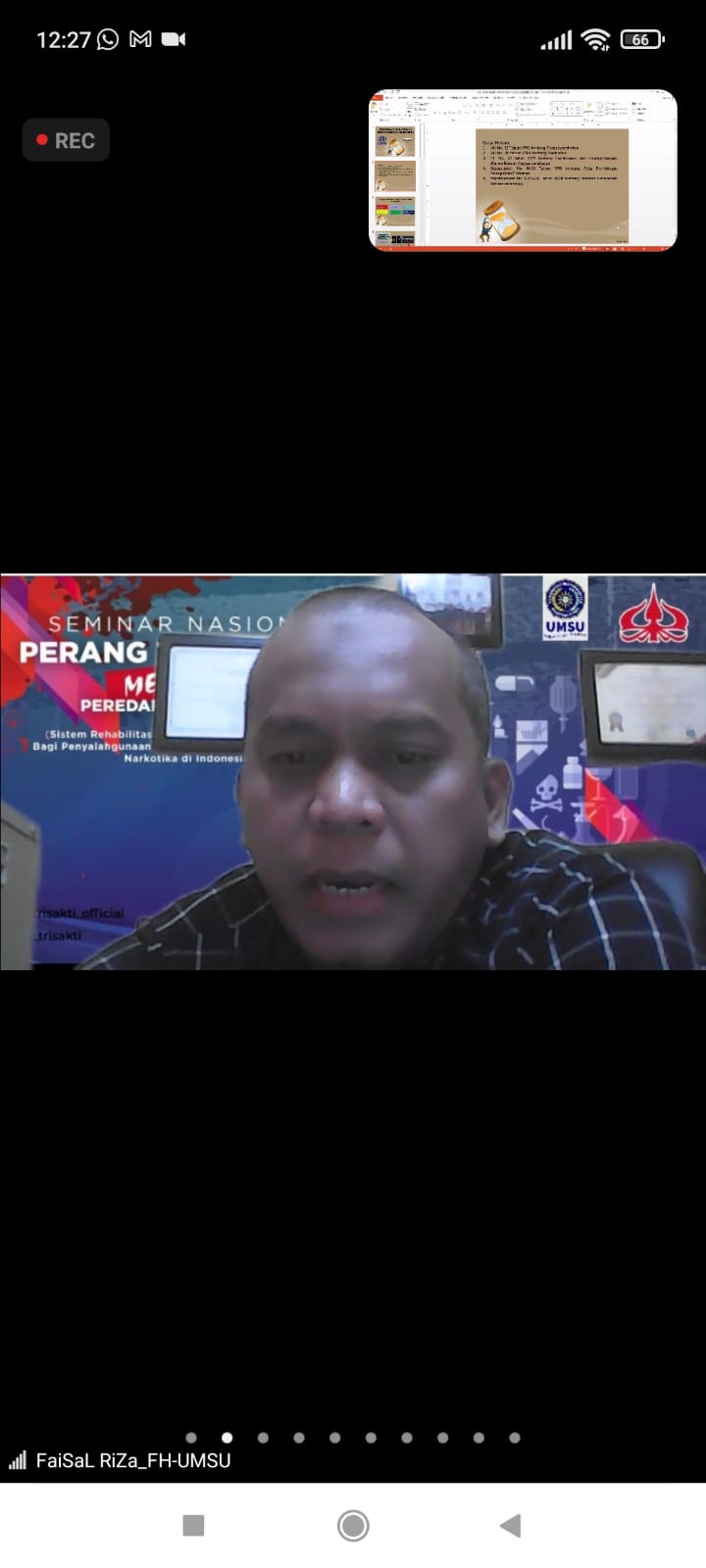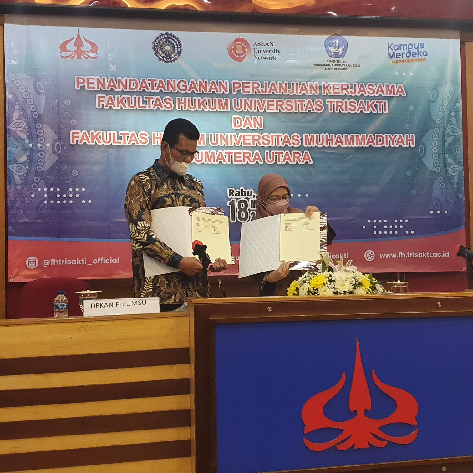 Fakultas Hukum UMSU selenggarakan Penandatanganan Perjanjian Kerja Sama dan Seminar Nasional antara Fakultas Hukum Universitas Trisakti dengan Fakultas Hukum Universitas Muhammadiyah Sumatera Utara, dengan tema Seminar Nasional :“Perang Tiada Akhir Melawan Peredaran Narkotika” kata sambutan dari Dekan Fakultas Hukum UMSU Dr. Faisal, SH., M. Hum dan Kata Sambutan dari Dekan Fakultas Hukum Universitas Trisakti Dr. dra. Hj. Siti Nurbaiti, SH.MH. sekaligus membuka acara Seminar Nasional yang diadakan di Universitas Trisakti melalui Via Zoom Meeting. Pada acara Seminar Nasional ini dua Dosen Fakultas Hukum UMSU mendapatkan kesempatan menjadi Narasumber antara lain: 1. Dr. Adi Mansyar, SH, M.Hum. dengan materi (Pelaksanaan Putusan Pengadilan Terhadap Penyalahguna Narkoba) dan 2. Faisal Riza, SH, MH. dengan materi (Pembinaan Terhadap Penyalahguna Yang Dipidanakan) dilaksanakan di Jakarta Rabu, 18/5/2022.