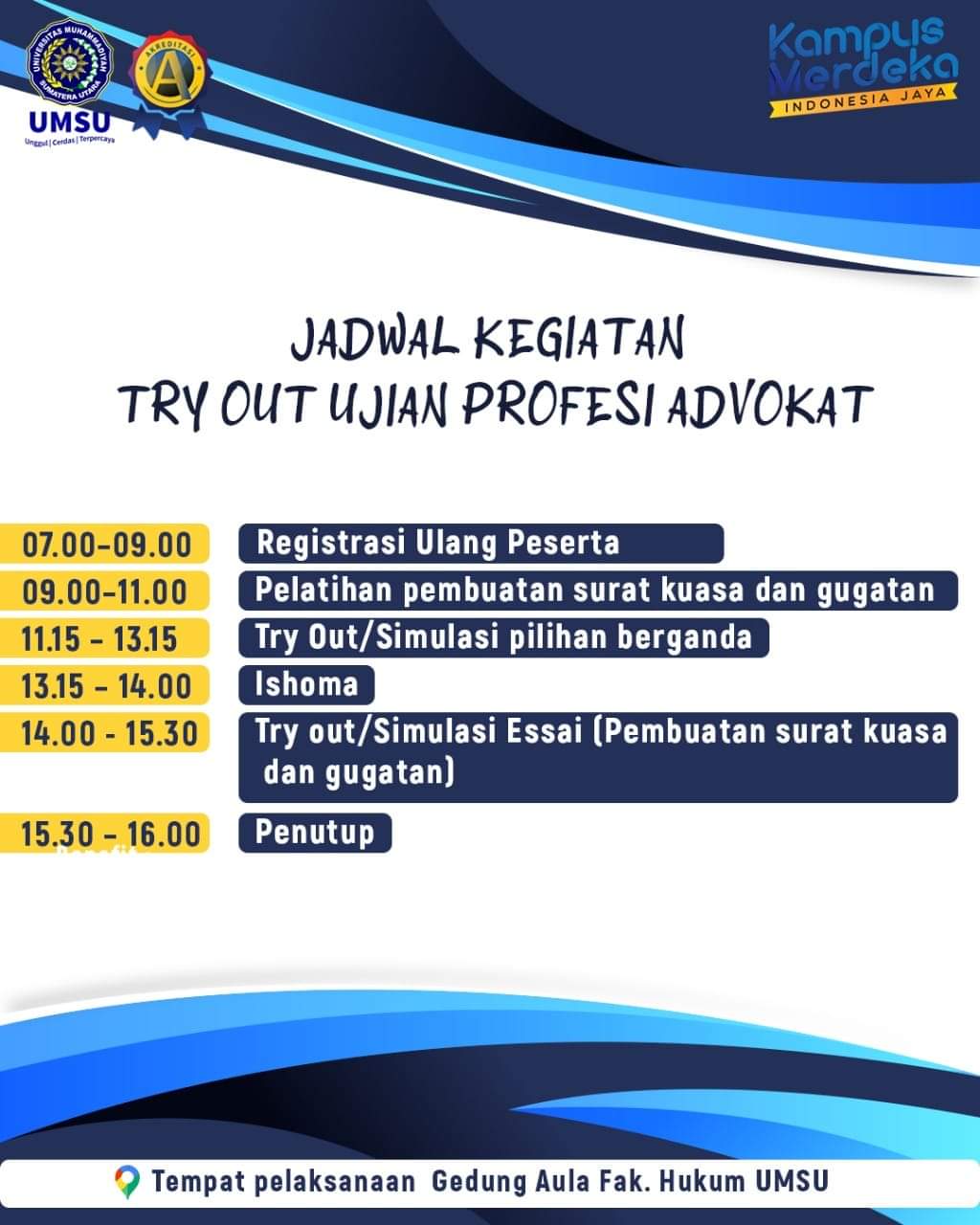 Fakultas Hukum UMSU menyelenggarakan try out bagi alumni fakultas hukum dari berbagai universitas untuk mengikuti try out sebagai upaya persiapan Ujian Profesi Advokat (UPA) yang akan dihadapi sebentar lagi. Sebagai bekal bagi yang sudah mengikuti PKPA, maka UMSU siap mematangkan para peserta yang akan mengikuti UpA dengan harapan akan semakin banyak lulusan Advokat untuk bisa disumpah dan beracara. Pendaftaran ty out dilaksanakan pada tanggal 25 Desember 2021 s.d 10 Januari 2022