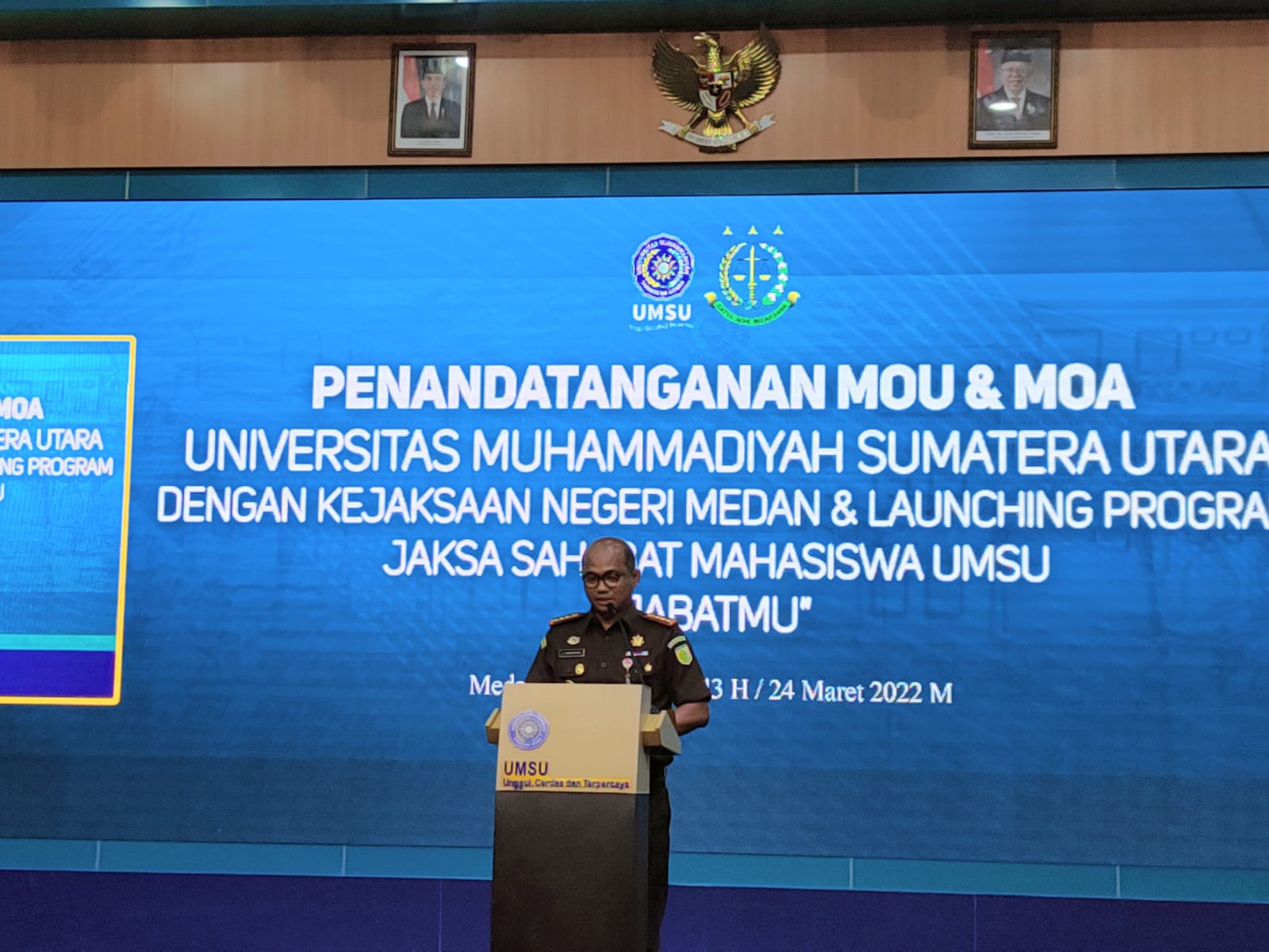 Kajari Medan Menjadi Narasumber pada kuliah umum dalam kegiatan Penandatanganan MoU-MoA UMSU dengan Kejaksaan Negeri Medan & Launching Program JabatMU “Jaksa Sahabat Mahasiswa UMSU” oleh Fakultas Hukum UMSU bekerjasama dengan kejaksaan negeri Medan Pada Kamis, 24 Maret 2022.
