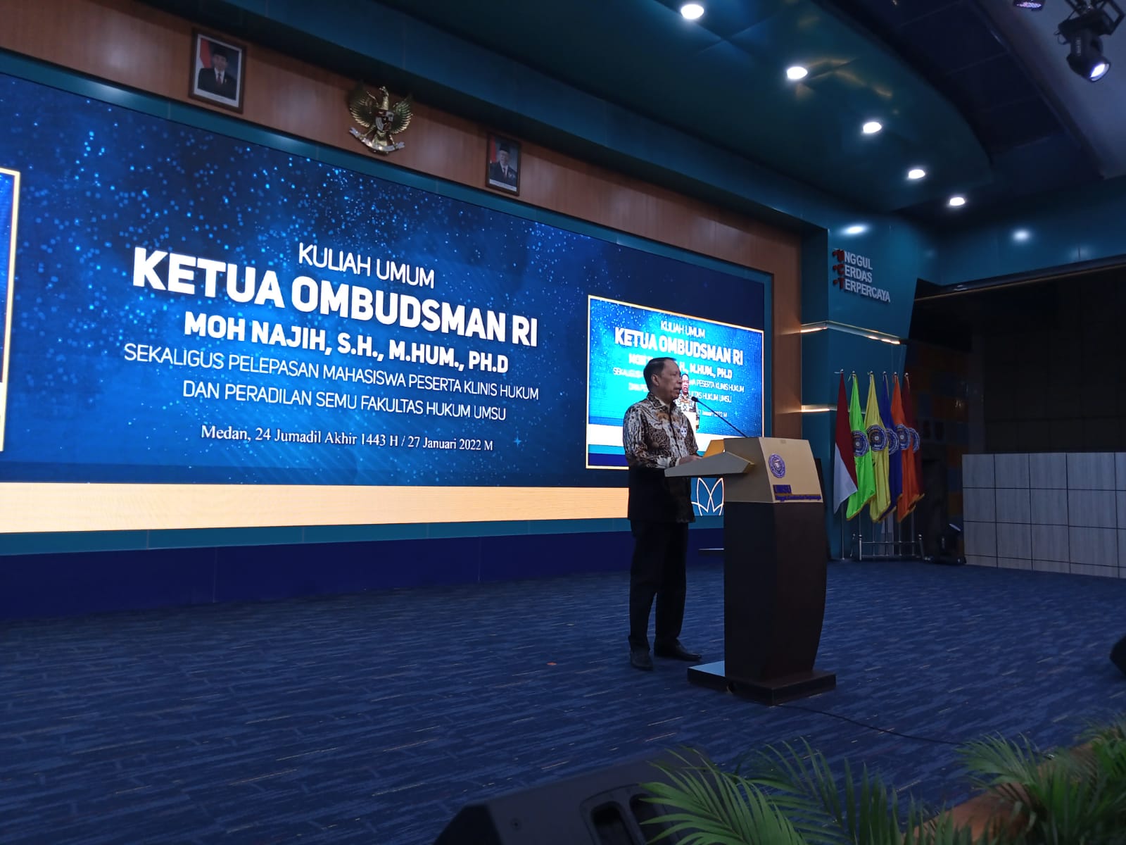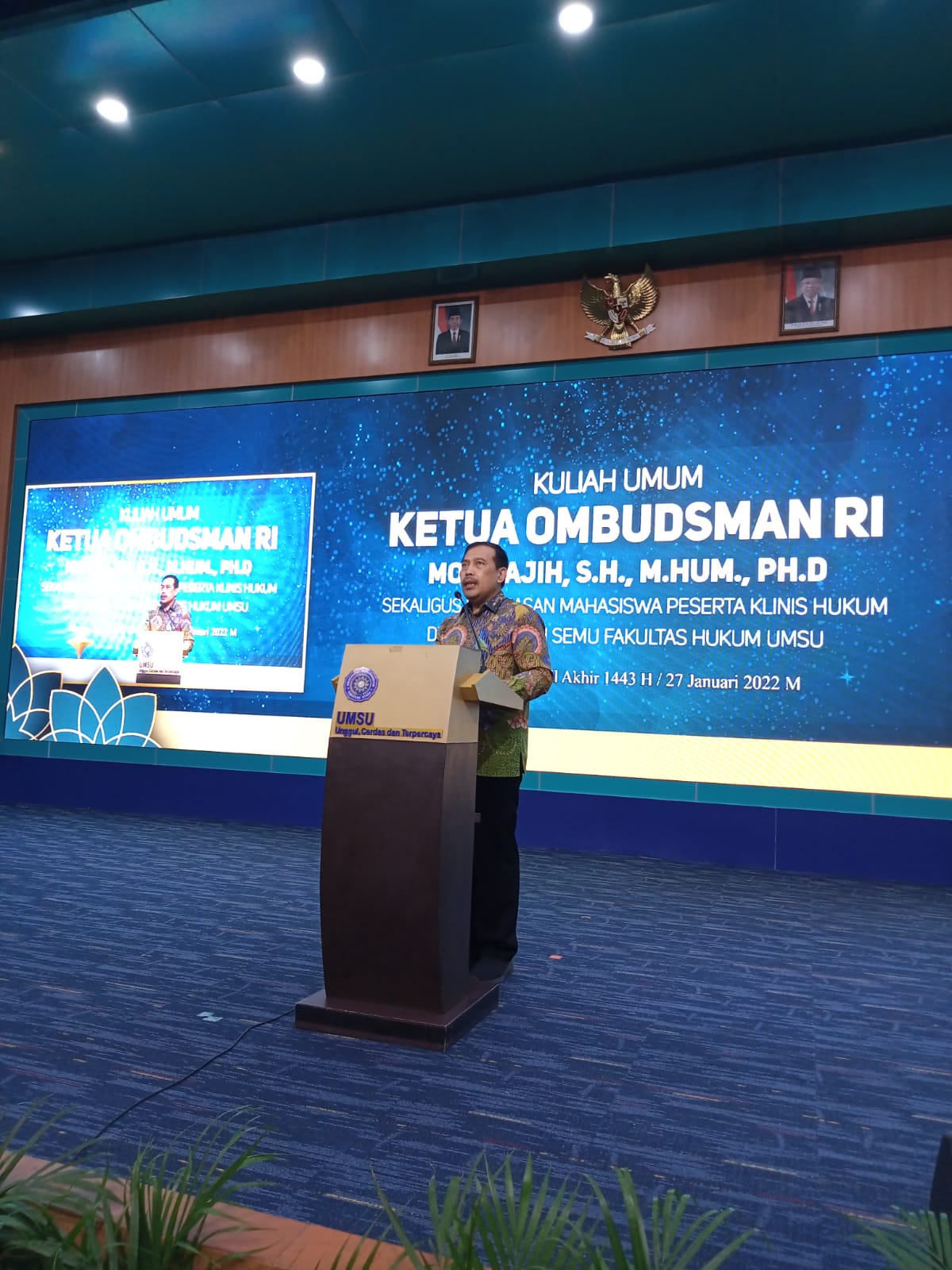 Ketua (OMBUDSMAN RI) Moh. Najih, SH., M.Hum., PH.D, memberikan Kuliah Umum di depan tiga ratus lebih peserta Pendadaran/Pembekalan Mahasiswa Klinis Hukum dan Peradilan Semu Fakultas Hukum UMSU, di Aula Kampus Universitas Muhammadiyah Sumatera Utara (UMSU).