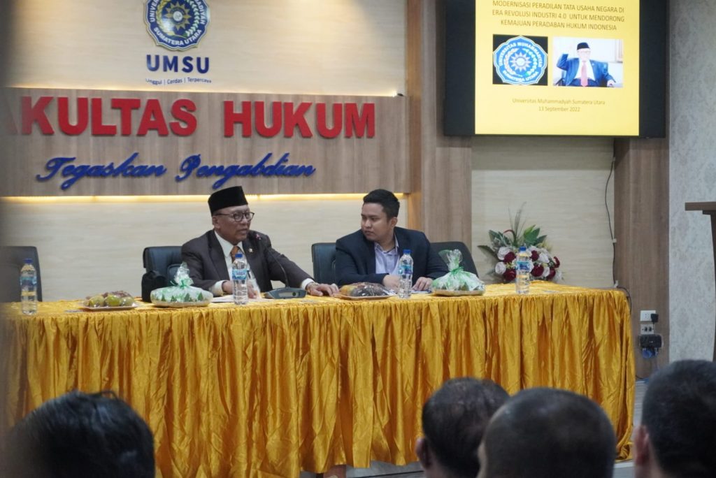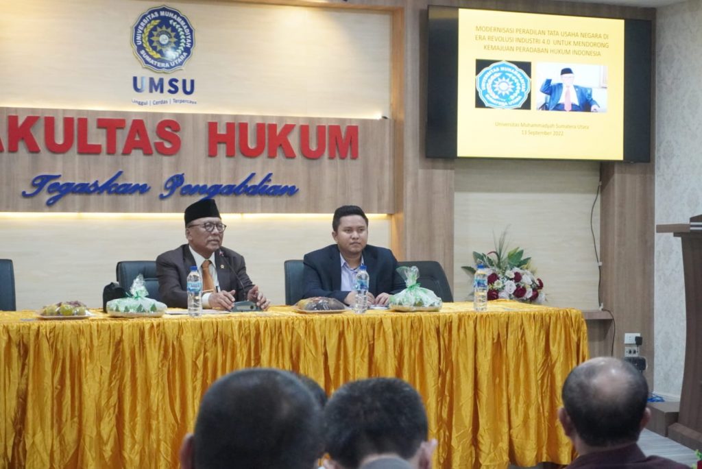 Selasa, 13 September 2022. Kuliah Umum yang diselenggarakan oleh Fakultas Hukum UMSU dengan Narasumber Prof. Dr. H. Supandi, S.H., M.Hum dengan Materi yaitu “Moderenisasi Peradilan Tata Usaha Negara di Era Revolusi Industri 4.0 Untuk Mendorong Kemajuan Peradaban Hukum Indonesia” di Aula Fakultas Hukum UMSU, yang di Moderatori oleh dosen Fakultas Hukum UMSU Ismail Koto, S.H., M.H
