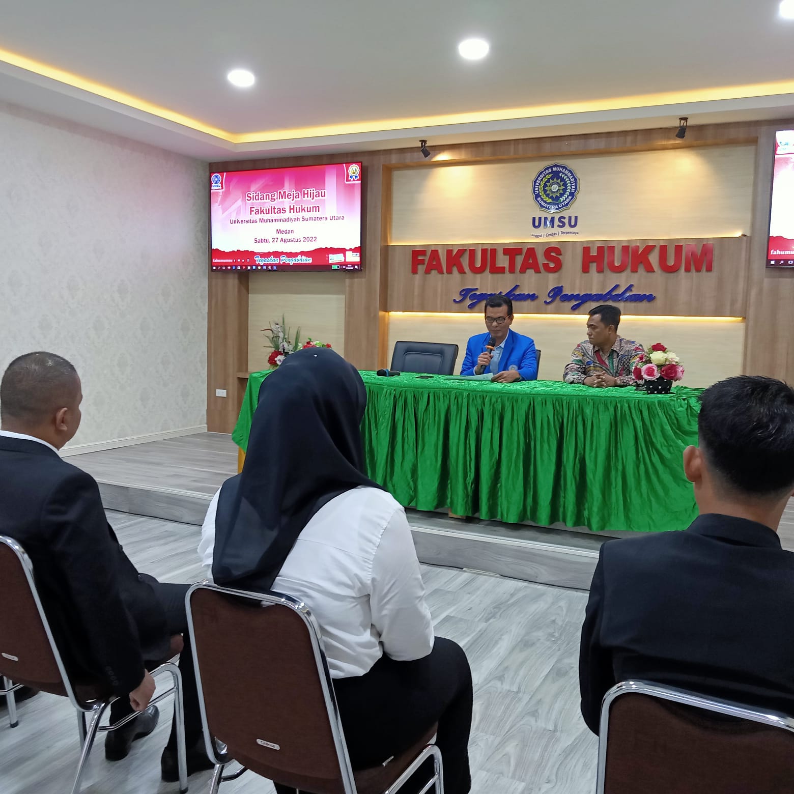 Sabtu, 27/8/2022 Dekan Fakultas Hukum UMSU Dr. Faisal, SH., M.Hum yang didampingi oleh Wakil Dekan I Dr. Zainuddin, SH., MH membuka Sidang Meja Hijau Fakultas Hukum UMSU dengan nomor undangan: 1221/II.3-AU/UMSU-06/F/2022 di ruang sidang gedung C Lt. I. Peserta sidang skripsi berjumlah Lima orang.