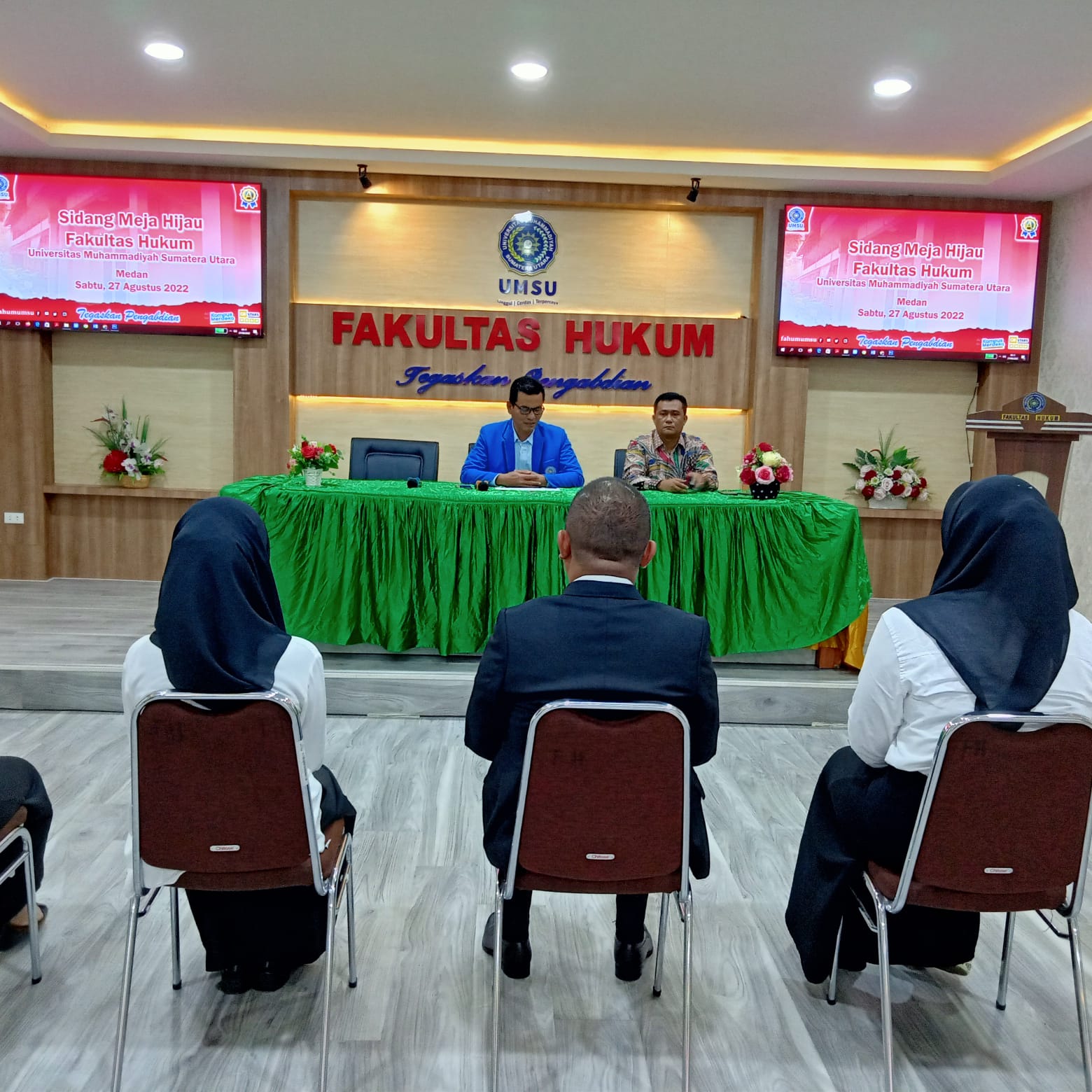 Sabtu, 27/8/2022 Dekan Fakultas Hukum UMSU Dr. Faisal, SH., M.Hum yang didampingi oleh Wakil Dekan I Dr. Zainuddin, SH., MH membuka Sidang Meja Hijau Fakultas Hukum UMSU dengan nomor undangan: 1221/II.3-AU/UMSU-06/F/2022 di ruang sidang gedung C Lt. I. Peserta sidang skripsi berjumlah Lima orang.