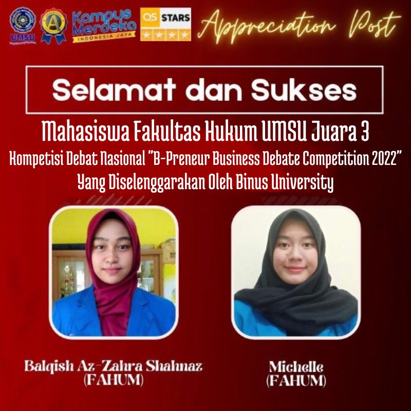 Alhamdulillah, mahasiswa Fakultas Hukum UMSU: Balqis Az Zahra Shahnaz dan Michelle, kembali mengukir prestasi tingkat nasional; juara 3 Kompetisi Debat Nasional “B-Preneur Business Debate Competition 2022” yang diselenggarakan oleh Binus University, pada tanggal 6 – 7 Agustus 2022 Ungkap Dr. Faisal S.H., M.H (Dekan Fakultas Hukum UMSU) yang didamping wakil Dekan I Dr. Zainuddin, S.H., M.,H dan wakil Dekan III Atikah Rahmi, S.H., M.H.