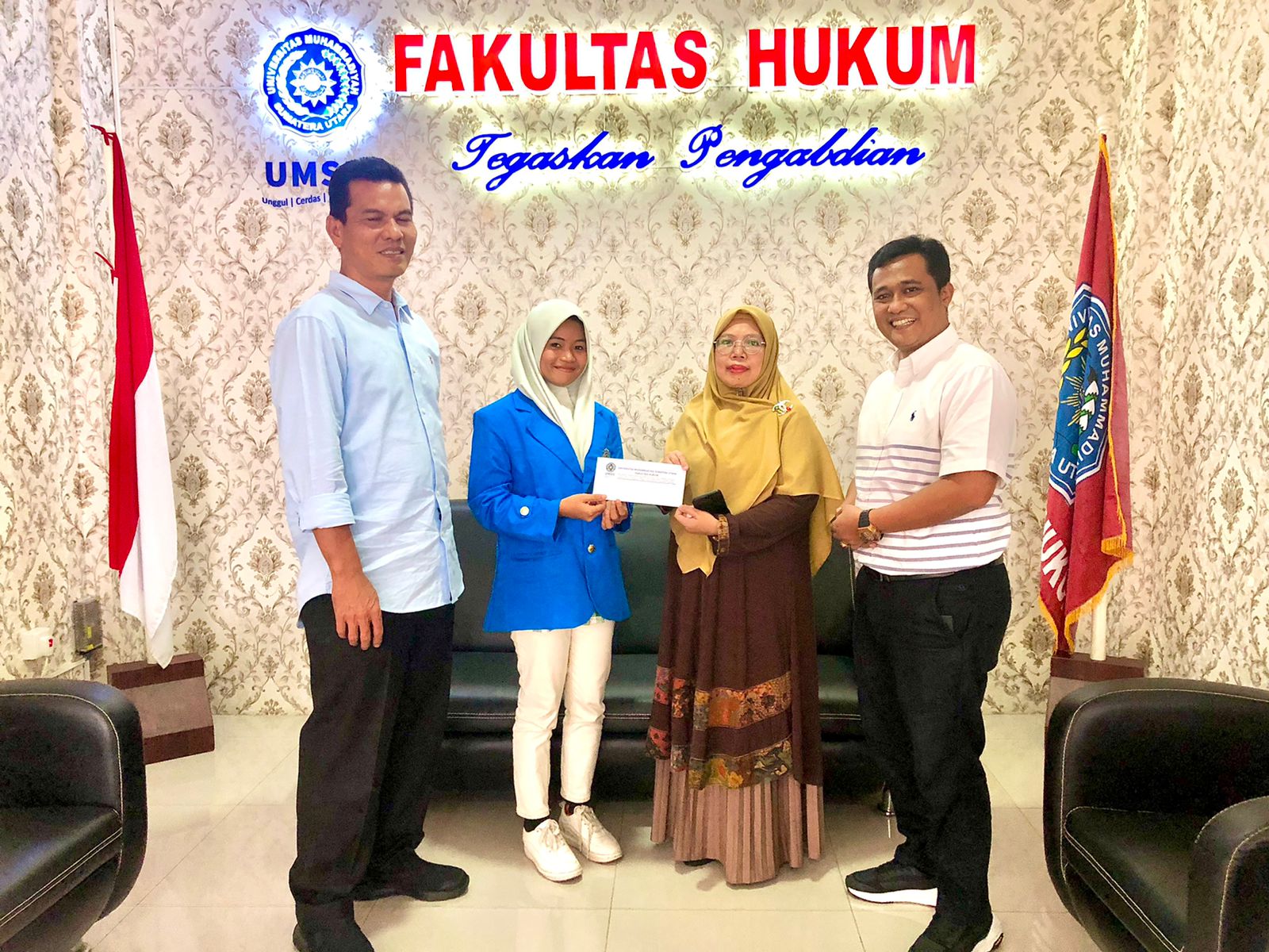 Dekan Fakultas Hukum UMSU, Dr Faisal, SH., M.Hum, didampingi Wakil Dekan 1, Dr. Zainuddin, SH MH dan Wakil Dekan 3, Atikah Rahmi, SH., MH memberikan tali asih kepada Ilmi Aini Adira, mahasiswa fakultas hukum UMSU sebagai bentuk apresiasi atas kejuaraan yg telah diraih. Ilmi nama panggilannya, berhasil meraih juara I Lomba orasi ilmiah tingkat nasional pada hari rabu, tanggal 17/8/2022 dengan tema “Gen Z Fight For Human Rights” yang diselenggarakan oleh Universitas Kristen Satya Wacana di Salatiga, Jawa Tengah.