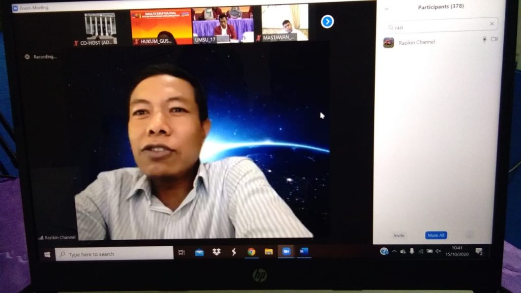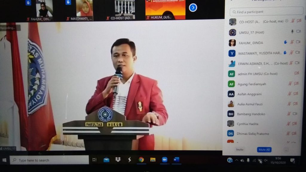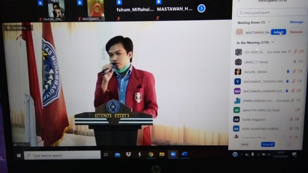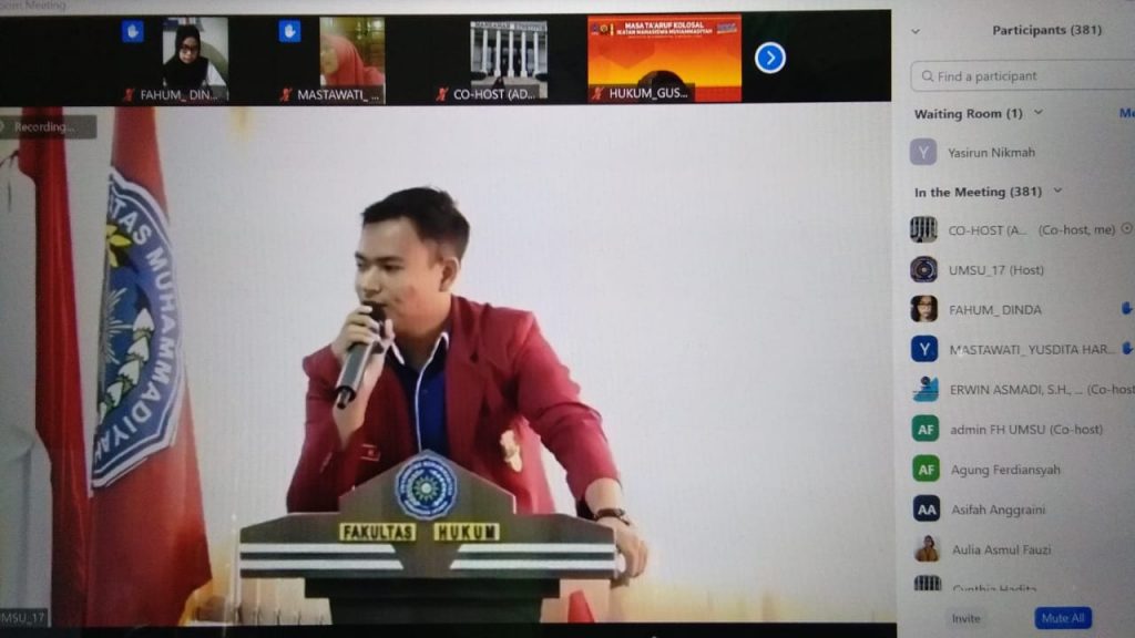 Dekan Fakultas Hukum UMSU membuka acara Masa Ta’aruf IMM Fakultas Hukum di Wakili oleh Wakil Dekan-III (Dr. ZAINUDDIN, SH., MH), didampingi oleh Wakil Dekan-I (FAISAL, SH., M.Hum) dengan tema “SATUKAN LANGKAH DAN JALIN IKATAN MENUJU MAHASISWA YANG RELIGIUS, INTELEKTUALITAS DAN HUMANIS” di Aula Lt, IV Gedung C Fakultas Hukum Jl. Kapten Muchtar Basri No. 3 Medan. 15/10/2020