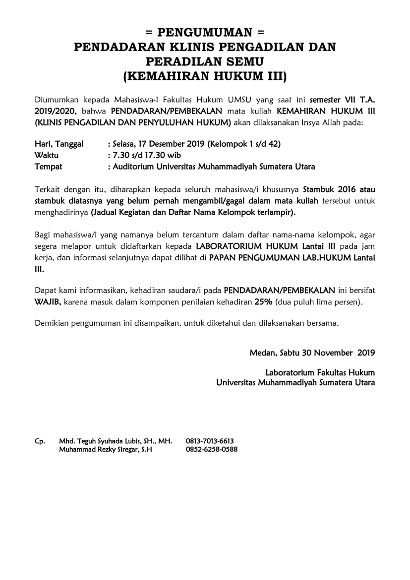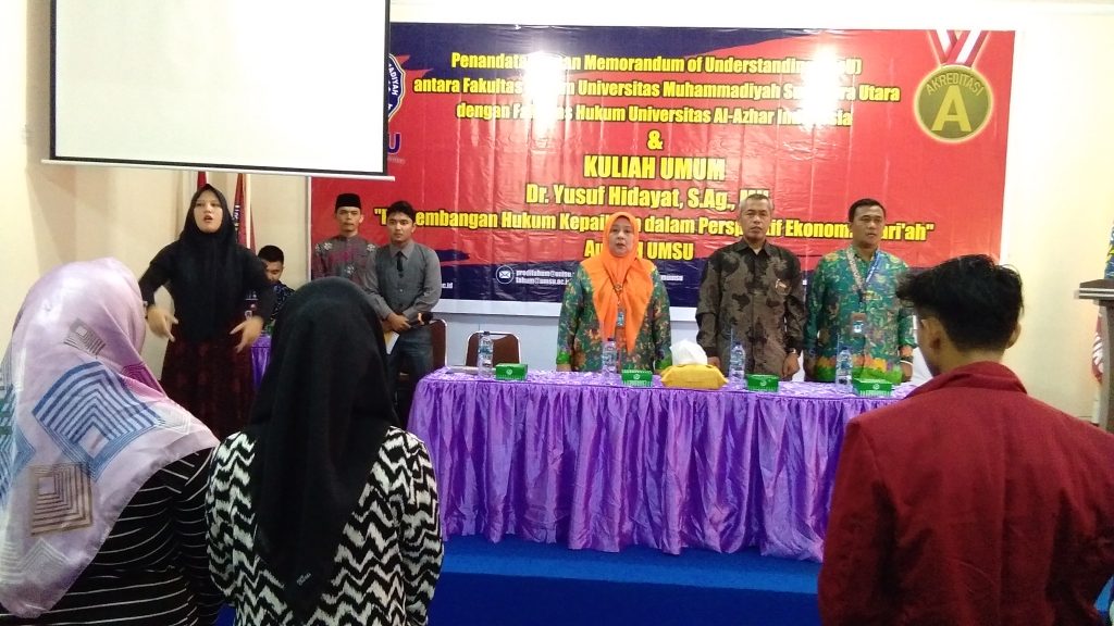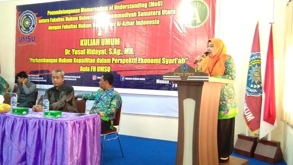 oleh Dr. YUSUF HIDAYAT, S.Ag., MH “Perkembangan Hukum Kepailitan dalam Perspektif Ekonomi Syaria’ah” di Aula Fakultas Hukum Lt. IV Gedung. C di Buka oleh Dekan Fakultas Hukum UMSU Dr. Ida Hanifah, SH., MH didampingi oleh Wakil Dekan-III Zainuddin, SH., MH dan Ka. Bagian Fakuktas Hukum Medan, 29/11/2019.
