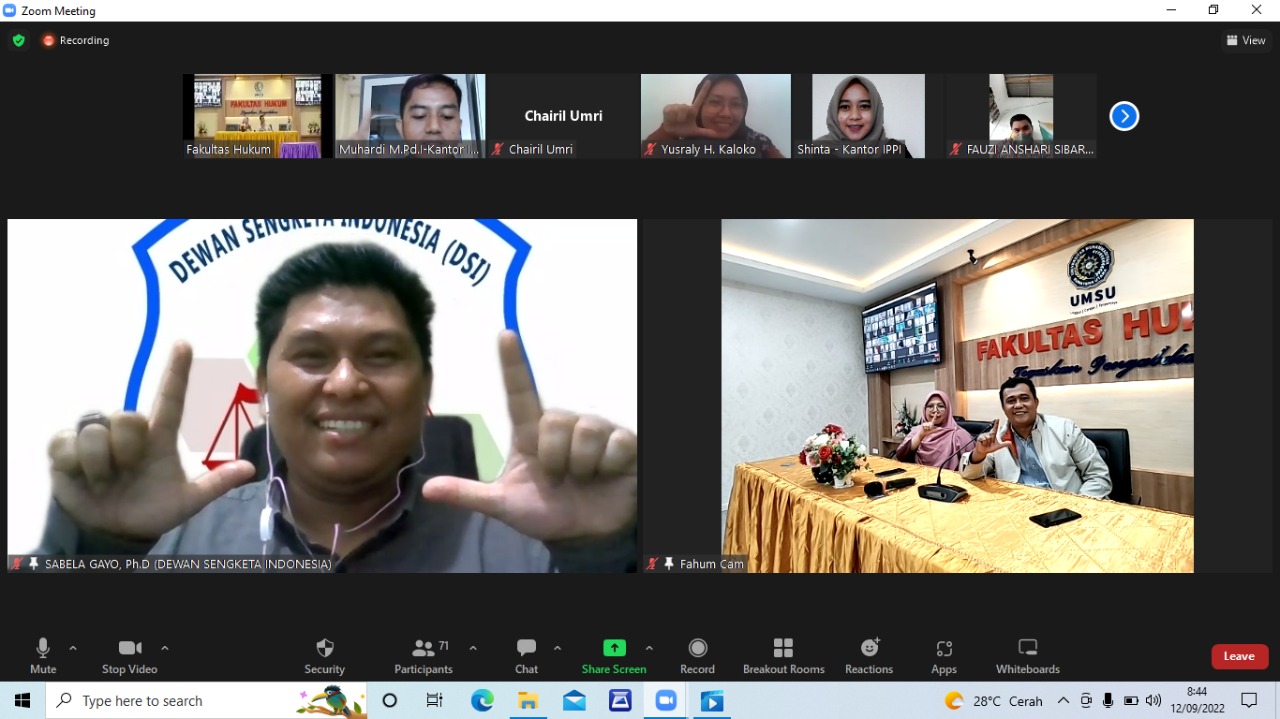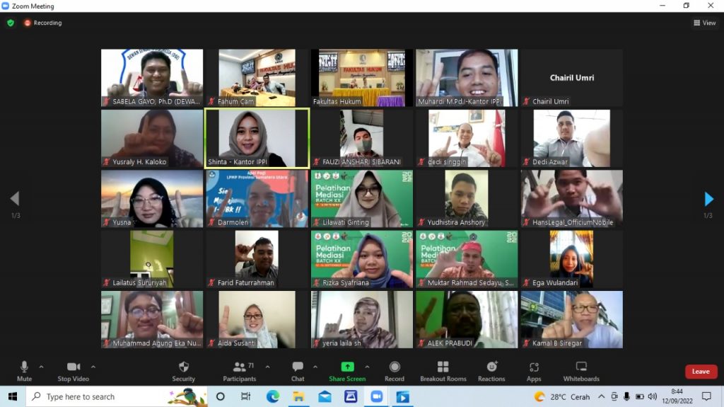 Senin, 12 September 2022 Fakultas Hukum UMSU bersama sama dengan Dewan Sengketa Indonesia mengadakan pembukaan pelatihan mediasi batch 1, acara dibuka dengan mengajak para peserta pelatihan mediator untuk sama sama menyanyikan lagu Indonesia raya dan Sang Surya.