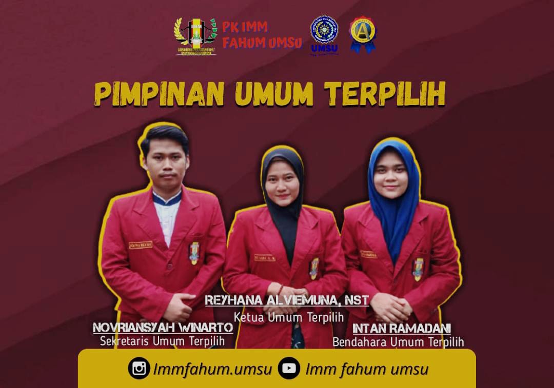 Selamat atas terpilihnya Pimpinan Umum PK IMM FAHUM Reyhana Alviemuna Nst sebagai ketua umum, Novriansyah Winarton sebagai Sekretaris Umum , dan Intan Ramadani. Semoga amanah dalam menjalankan tugas.