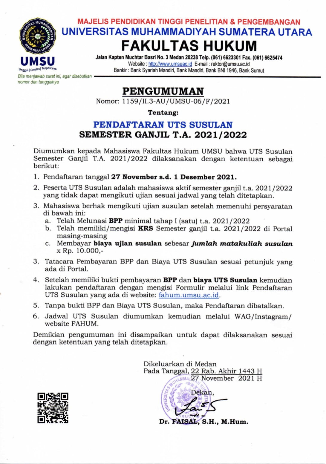 Pendaftaran susulan UTS semester Ganjil Fakultas Hukum Universitas Muhammadiyah Sumatera Utara