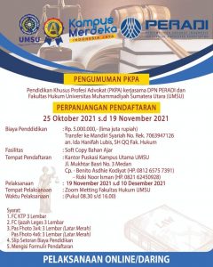 PERADI bersama Fakultas Hukum UMSU kembali mengadakan PKPA yang akan di laksanakan secara virtual pada tanggal 19 November s/d 10 Desember 2021 didukung oleh pemateri/pengajar profesional dari berbagai latar belakang, materi yang relevan serta jaringan yang luas akan membantu peserta menjadi advokat profesional yang berkompeten.
