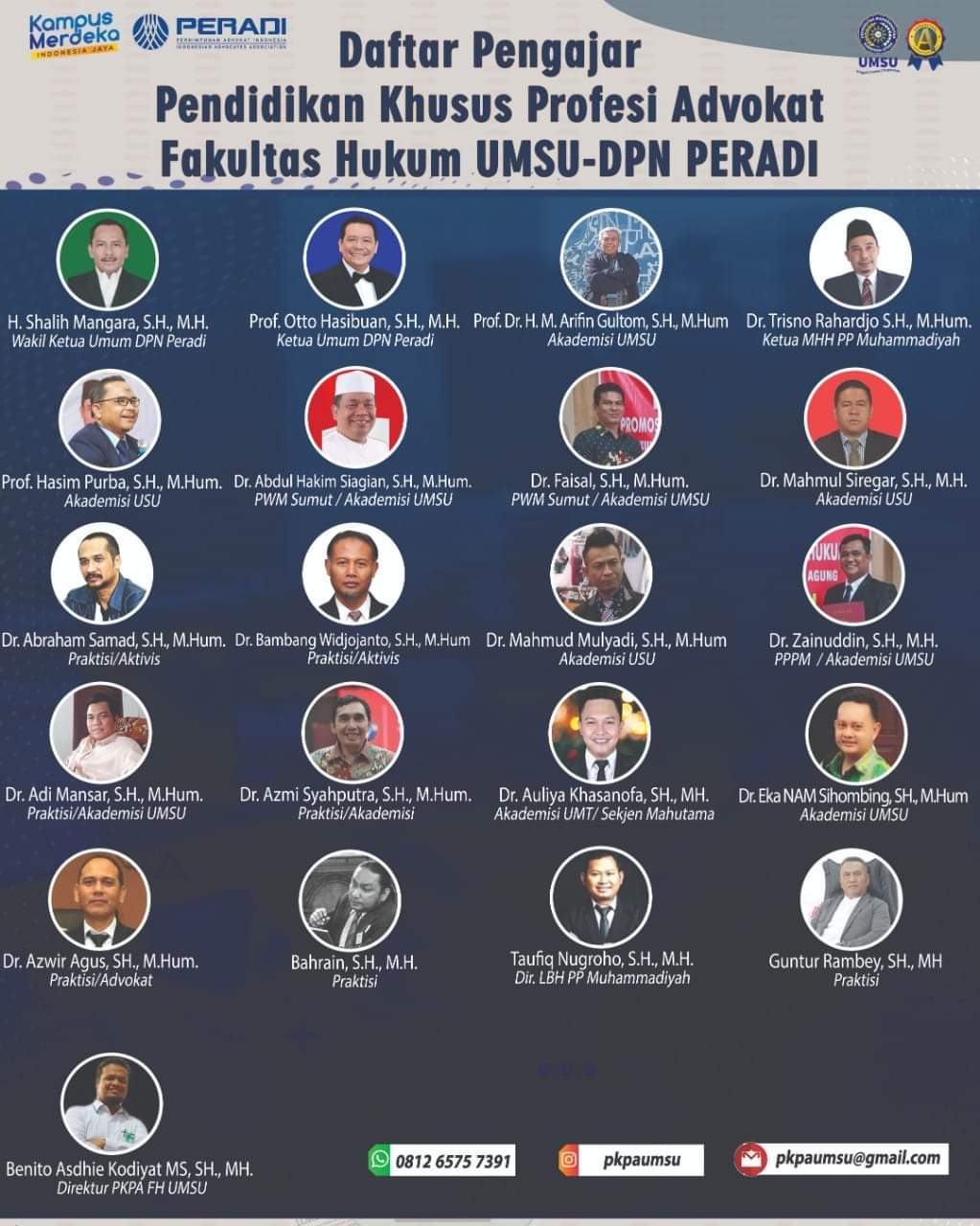 PERADI bersama Fakultas Hukum UMSU kembali mengadakan PKPA yang akan di laksanakan secara virtual pada tanggal 19 November s/d 10 Desember 2021 didukung oleh pemateri/pengajar profesional dari berbagai latar belakang, materi yang relevan serta jaringan yang luas akan membantu peserta menjadi advokat profesional yang berkompeten.