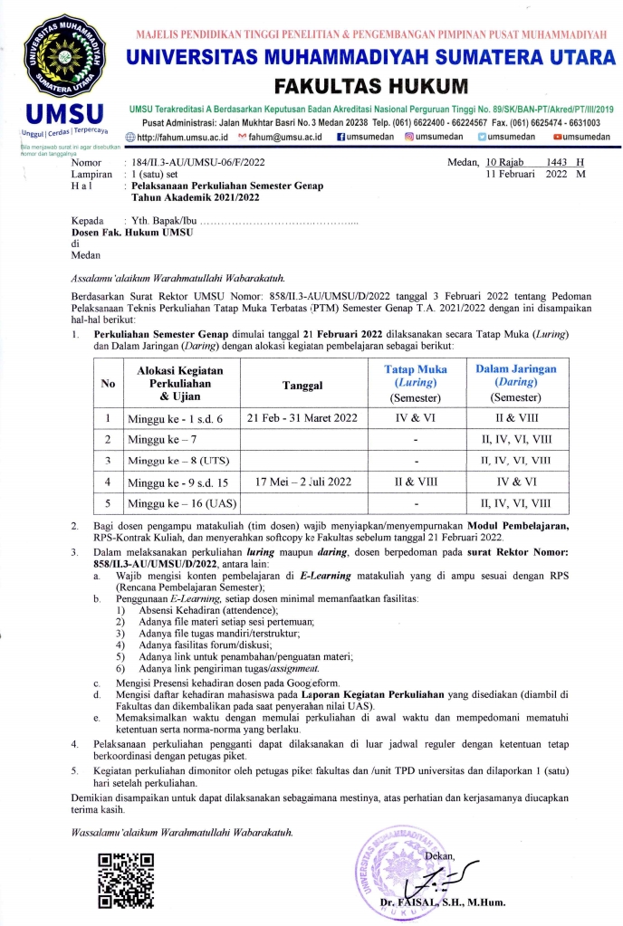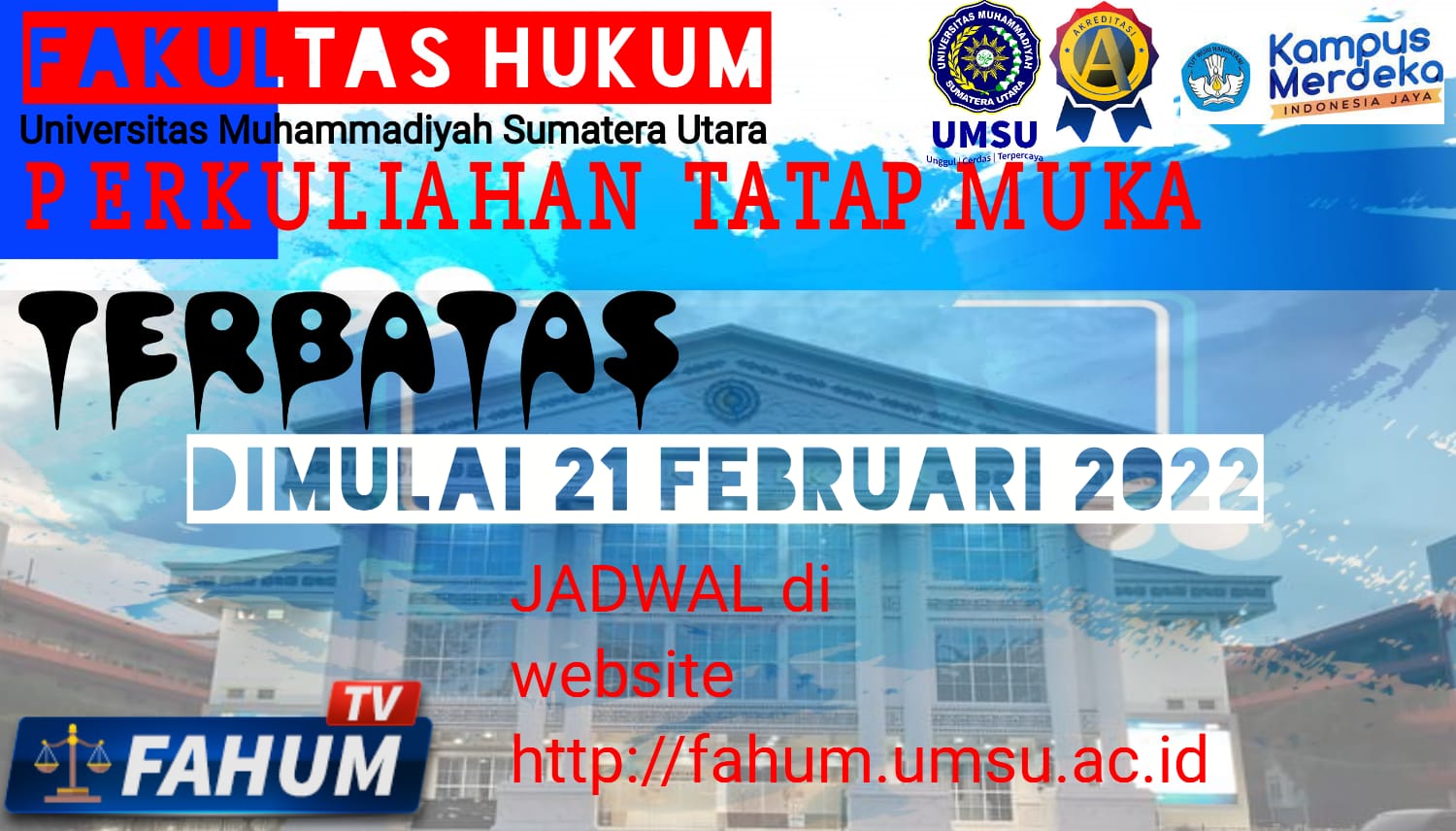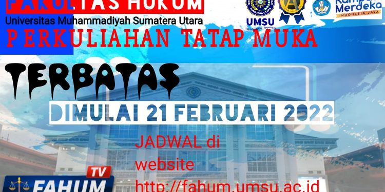Fakultas Hukum Universitas Muhammadiyah Sumatera Utara akan melaksanakan perkuliahan tatap muka terbatas, berdasarkan surat Rektor Universitas Muhammadiyah Sumatera Utara tentang pedoman pelaksanaan teknis perkuliahan tatap muka terbatas (PTM) semester genap, yang akan dilaksanakan secara tatap muka (luring) untuk semester IV & VI dan dalam jaringan (daring) semester II & VIII pada tanggal 21 Februari 2022, pelaksanaan ini sesuai dengan jadwal yang terlampir. Medan 15/2/2022.