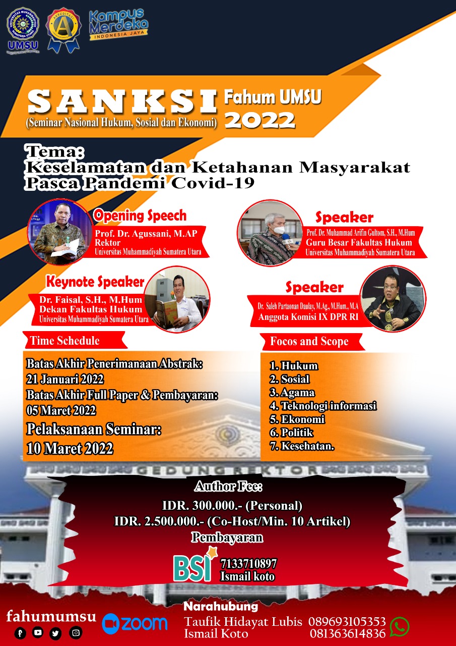 Sehubungan dengan akan dilaksanakan Seminar Nasional Hukum, Sosial dan Ekonomi (SANKSI) tahun 2022 yang akan diselenggarakan oleh Fakultas Hukum Universitas Muhammadiyah Sumatera Utara yang Insyallah akan dilaksanakan pada: