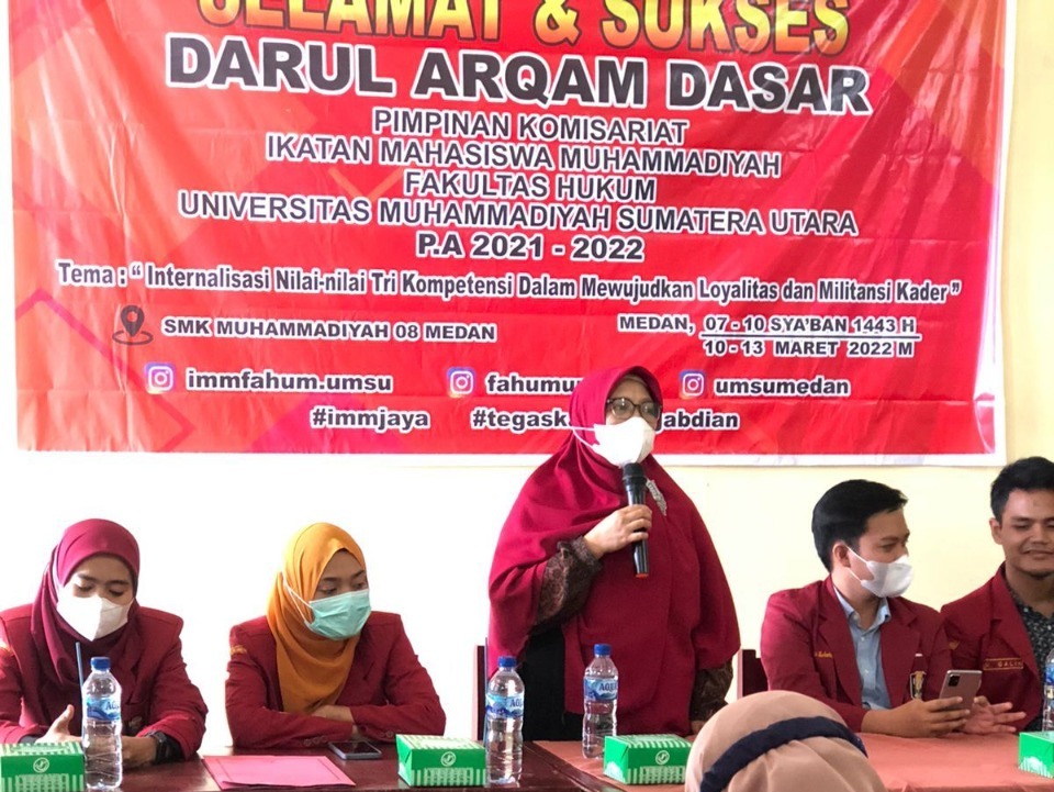 Medan, 11 Maret 2022. Wakil Dekan III Fakultas Hukum UMSU, Atikah Rahmi, SH., MH membuka kegiatan Darul Arqam Dasar (DAD) yang diselenggarakan di SMK 8 Muhammadiyah, pada hari Kamis, 10 Maret 2022. Kegiatan ini berlangsung mulai tanggal 10 s/d 13 Maret 2022, diikuti oleh 20 orang peserta. Dalam sambutannya, WD 3 Fahum UMSU memberikan apresiasi yang tinggi terhadap pimpinan komisariat dan panitia yang telah berusaha semaksimal mungkin untuk mempersiapkan kegiatan DAD yang bertema; internalisasi nilai-nilai tri kompetensi dalam mewujudkan loyalitas dan militansi kader”. Ucapan terima kasih disampaikan kepada ketua pimpinan cabang IMM (demisioner), Tengku Suhaimi yang telah memberikan membimbing dan memberikan motifasi kepada adek-adek di komisariat FH UMSU.