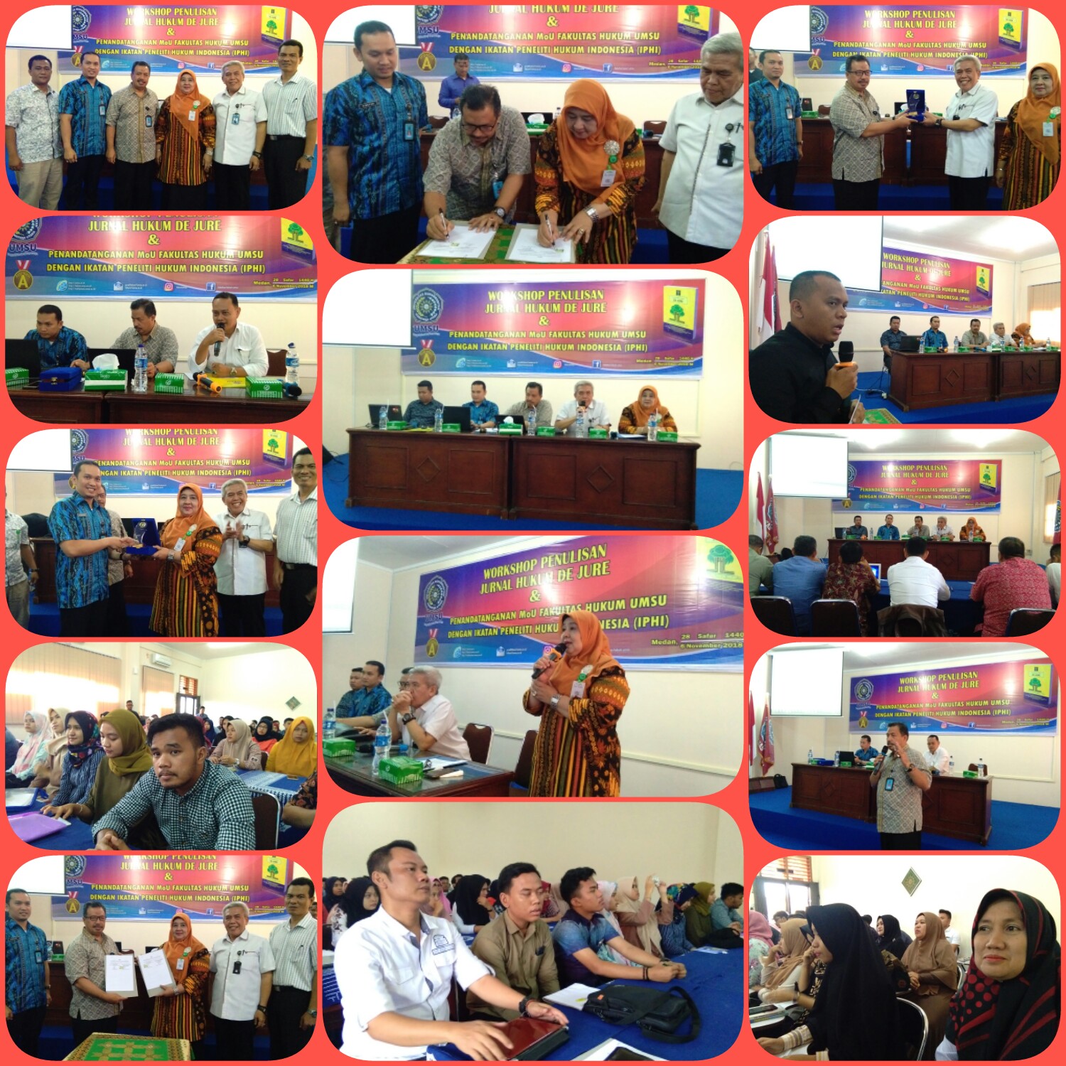 Workshop Penulisan Jurnal Hukum De Jure & Penandatanganan MoU Fakultas Hukum UMSU dengan Ikatan Penelitian Hukum Indoneaia (IPHI) Dibuka oleh Dekan (Ida Hanifah, SH., MH) diwakili oleh Wakil Dekan-I (Faisal, SH., M.Hum), Wakil Dekan-III (Zainuddin, SH.,MH). Kata Sambutan diberikan oleh Wakil Rektor-I (Dr. Muhammad Arifin, SH.,M.Hum).